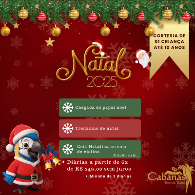 Aproveite um Natal inesquecível no Cabanas! O pacote conta com Ceia Especial de Natal, Trenzinho de Natal, piscinas termais e muito mais para toda a família.