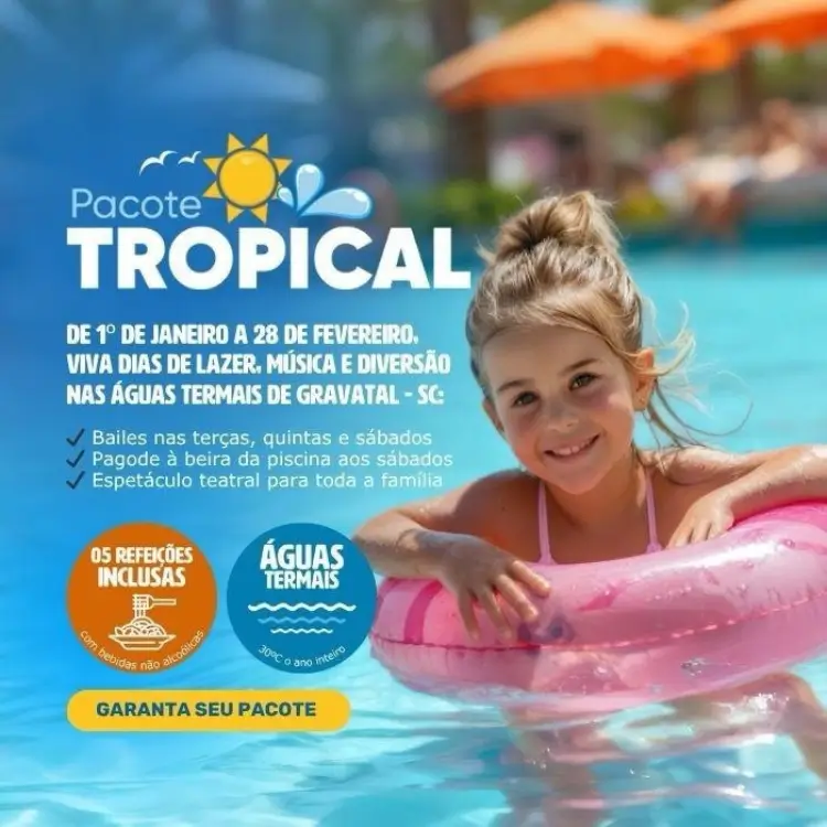 Viva um verão Tropical no Hotel Internacional Gravatal, de 1º de janeiro a 28 de fevereiro com bailes, pagode à beira da piscina, espetáculo teatral e muito mais*!